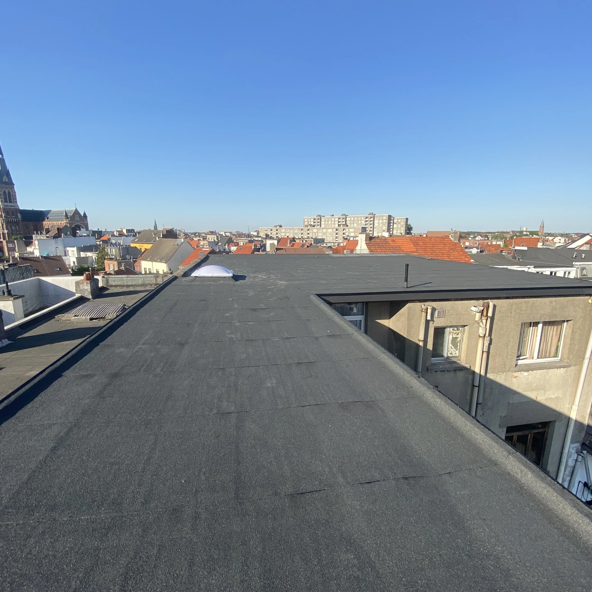 Dakisolatie van 12cm dubbelzijdig bitumen (KW5.45)/ zelfklevend onderlaag en bovenlaag roofing met leislag, Afwerken dakranden met mat zwarte alu dakranden. Afbraak van oude schouw.